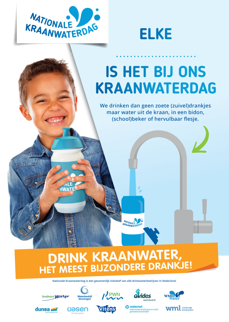 Om na Nationale Kraanwaterdag het drinken van kraanwater op één of meer vaste dagen in de week aan te moedigen kun je ook gebruikmaken van de Kraanwaterdagposter. Met deze poster, die je zichtbaar ophangt, laat je kinderen en ouders zien op welke dag(en) de kinderen op jouw groep alleen maar kraanwater drinken en geen gezoete (zuivel)drankjes.